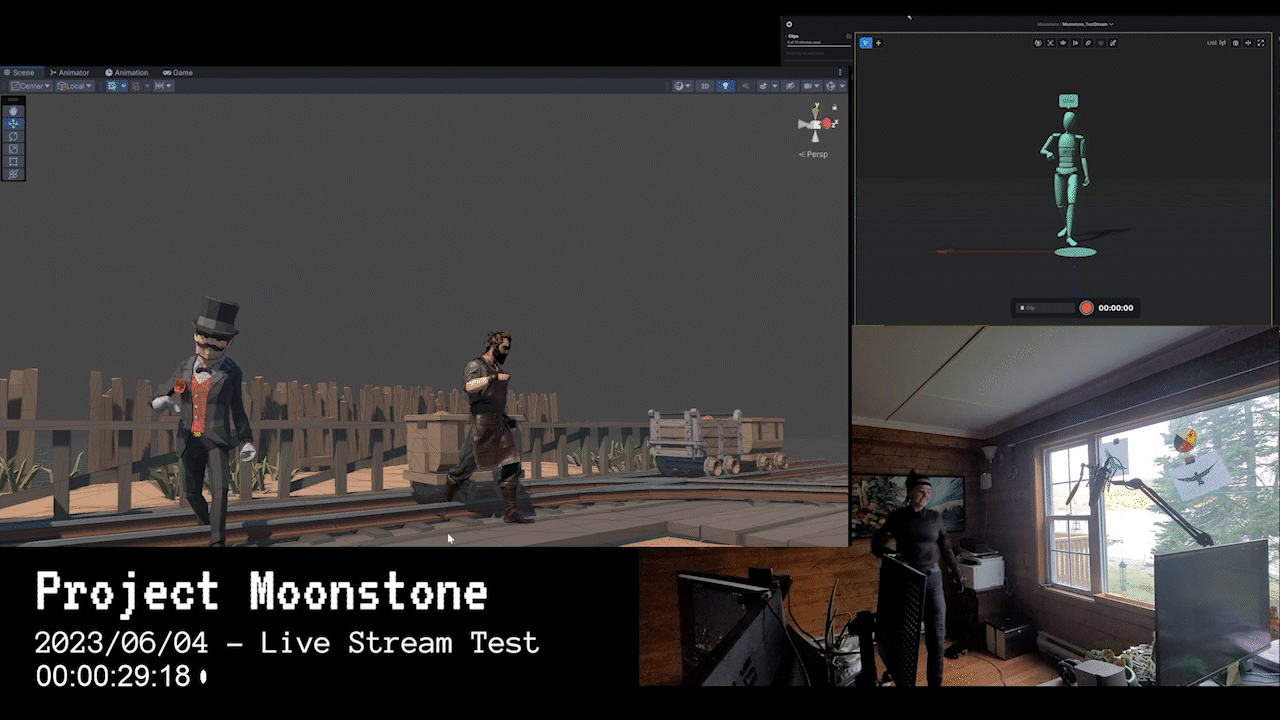 In collaboration with Todd Hennessey at the Centre for Research and Innovation in Corner Brook, Newfoundland, DCXIX is developing a mixed-reality entertainment experience like no other. Project Moonstone is a linear narrative, virtual reality show incorporating live performance and audience participation that achieves a unique, shared-entertainment event. A virtual host, animated from real-time motion capture data, guides the audience through a series of ghost stories as collected and told on the Corner Brook Ghost Walk. The ambitious project streams live performance capture data into the Unity game engine, where it is synchronized and broadcast to participants for a shared virtual tour of Corner Brook's haunted history.